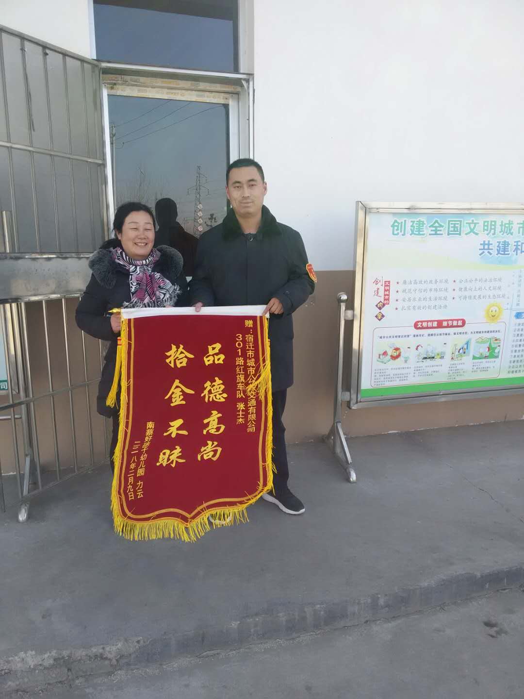 2018.02.09:301路駕駛員張士杰撿到并及時歸還一只內(nèi)有4300余元現(xiàn)金和身份證、銀行卡等重要證件的黑色女包,失主力女士為表感恩贈送錦旗。