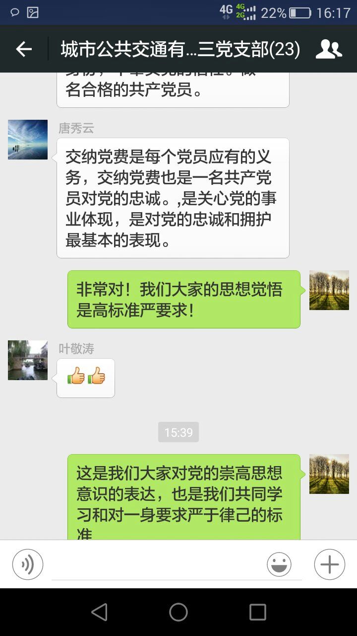 截止目前,公司各支部通過(guò)微信群開(kāi)展了“我看黨費(fèi)”微討論,組織黨員收看了市委組織部制作的《黨章熠熠放光芒》音樂(lè)快板視頻,既創(chuàng)新了“兩學(xué)一做”學(xué)習(xí)教育形式,又促進(jìn)了宿遷公交戰(zhàn)線學(xué)教活動(dòng)的深入開(kāi)展。